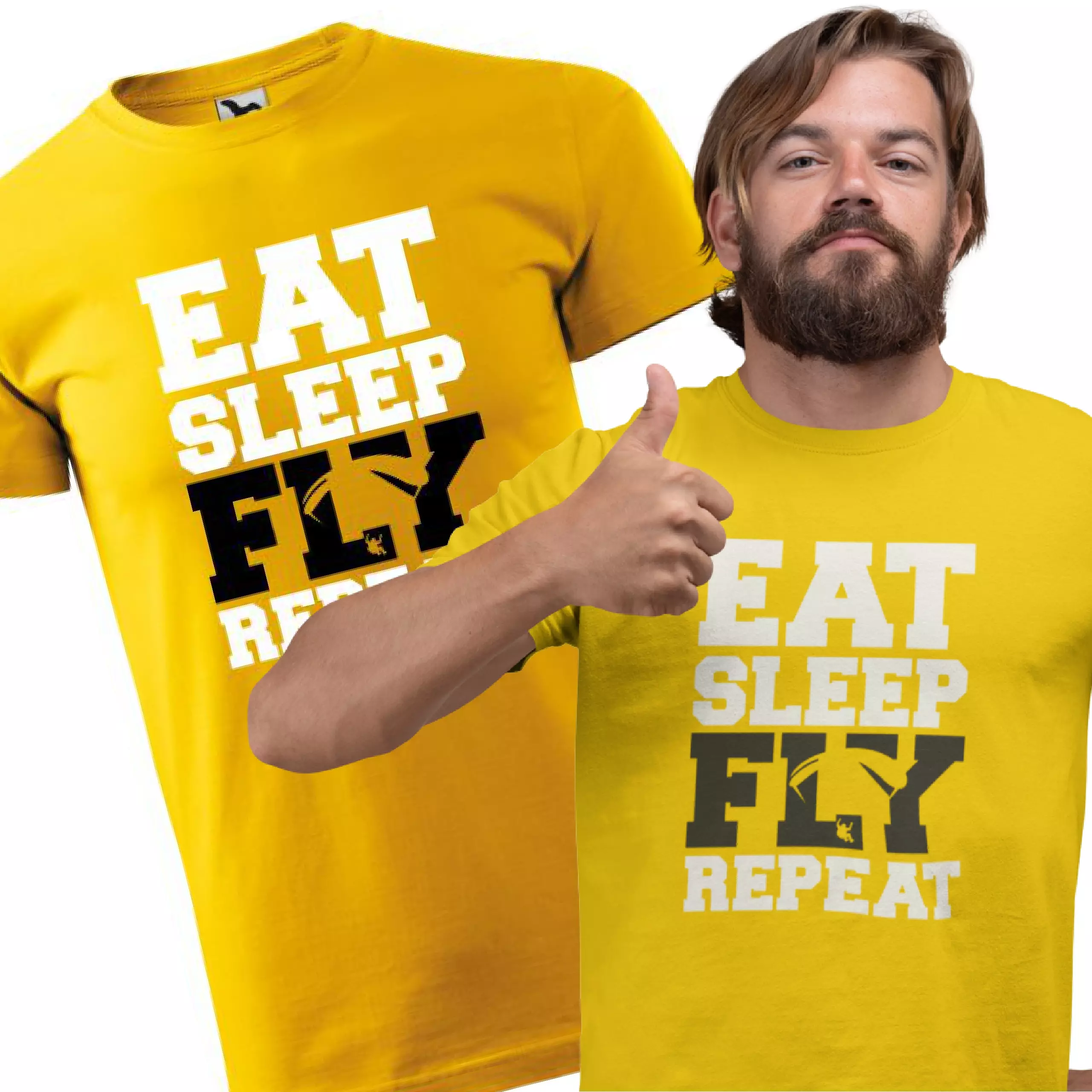 Słowa "Eat Sleep Fly Repeat" są jak mantra, która podkreśla esencję życia pełnego pasji do latania. To jak codzienne rytuały – jedzenie, sen, a potem lot, powtórzone w nieskończoność. Ta koszulka nie tylko mówi o tym, co robimy, ale także o tym, co kieruje naszym życiem.