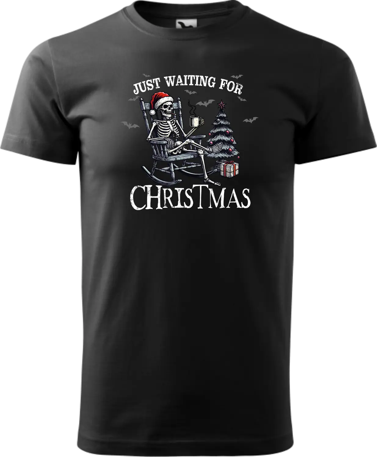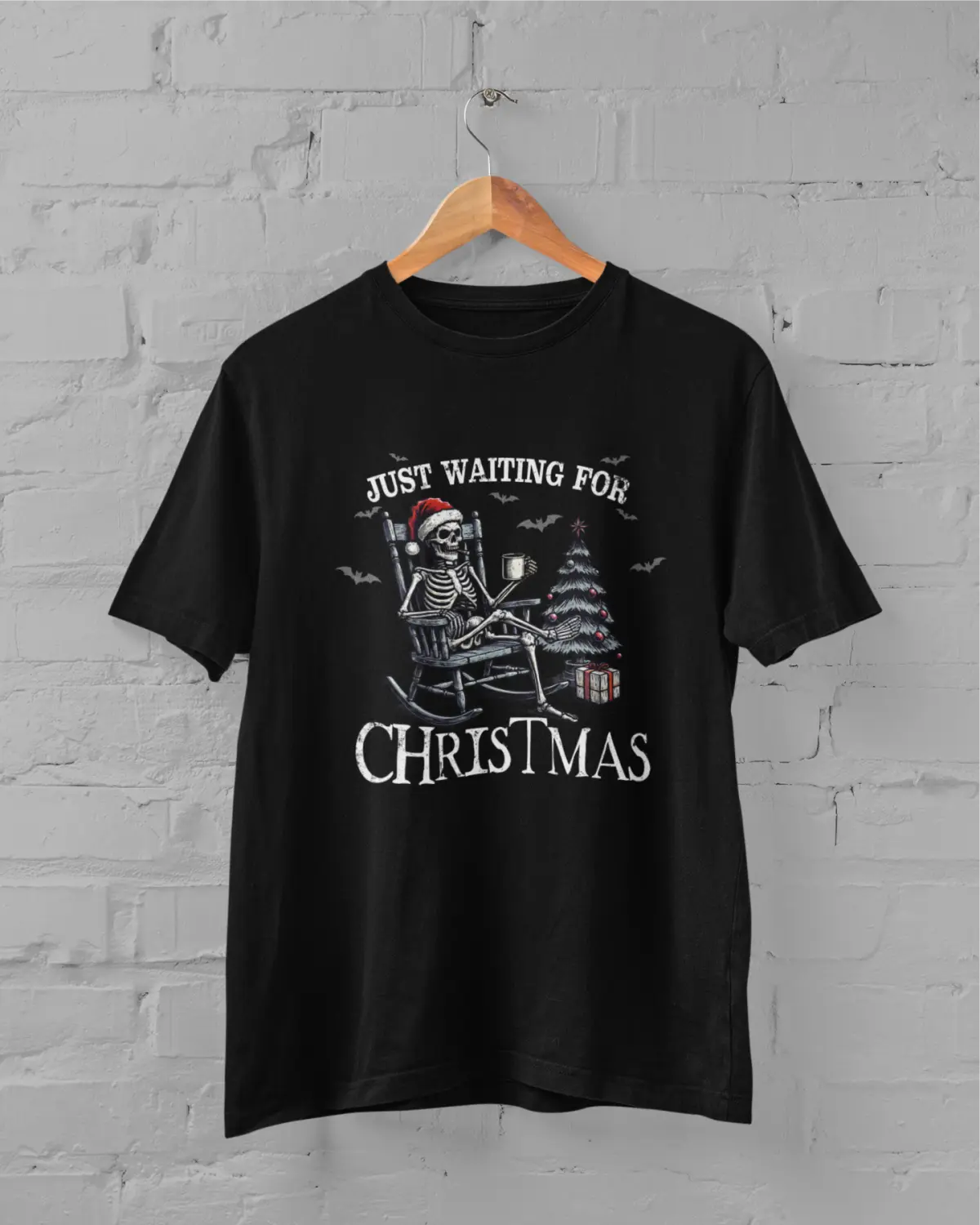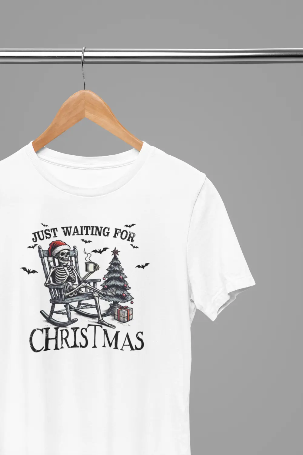 Zbliżają się Święta Bożego Narodzenia, a Ty chcesz wyróżnić się w tłumie? Nasza męska koszulka z nadrukiem kościotrupa w czapce Mikołaja, bujającego się na fotelu z napisem "Just Waiting for Christmas", to doskonały wybór! To idealny sposób na wyrażenie swojego poczucia humoru i stylu, jednocześnie celebrując radosny czas świąteczny.