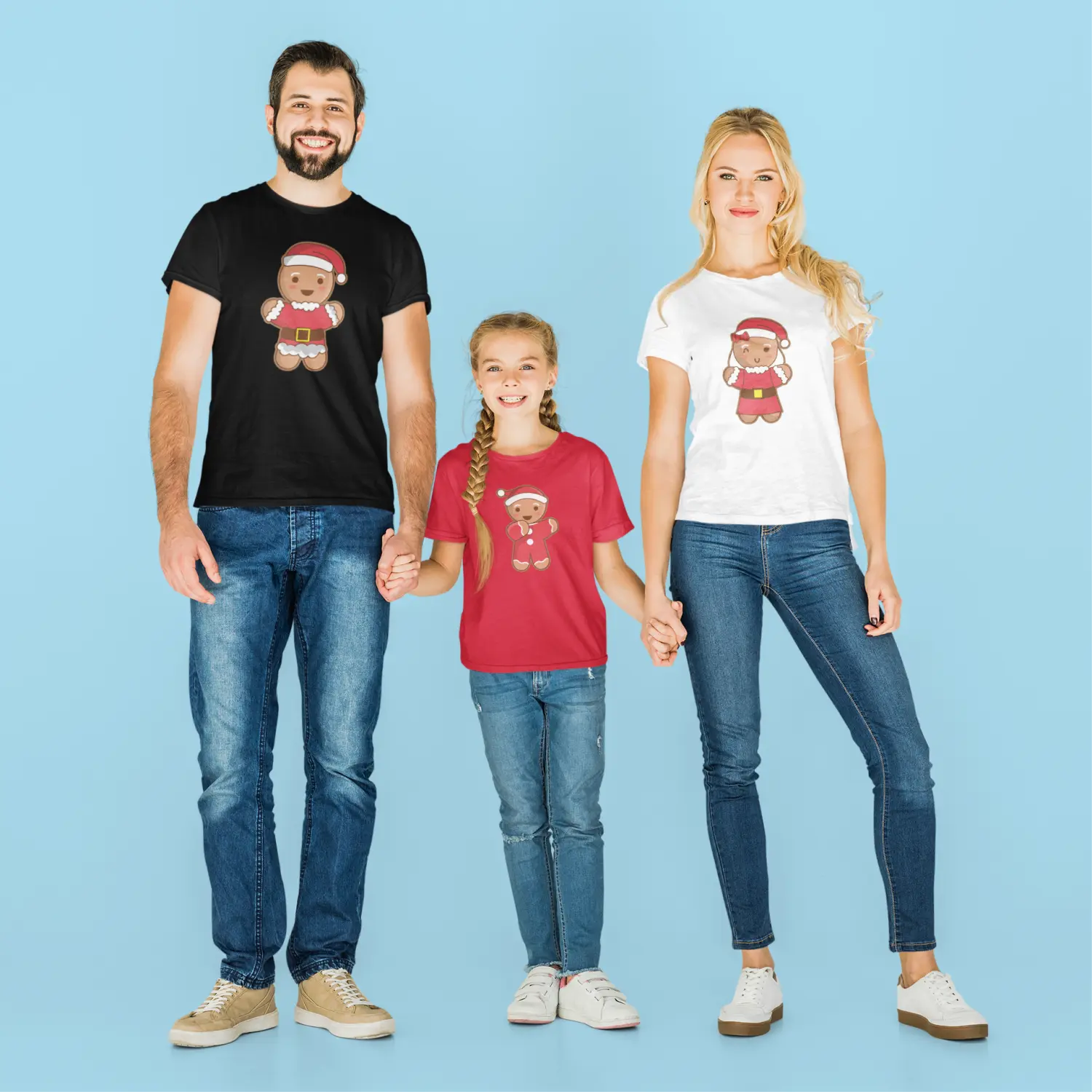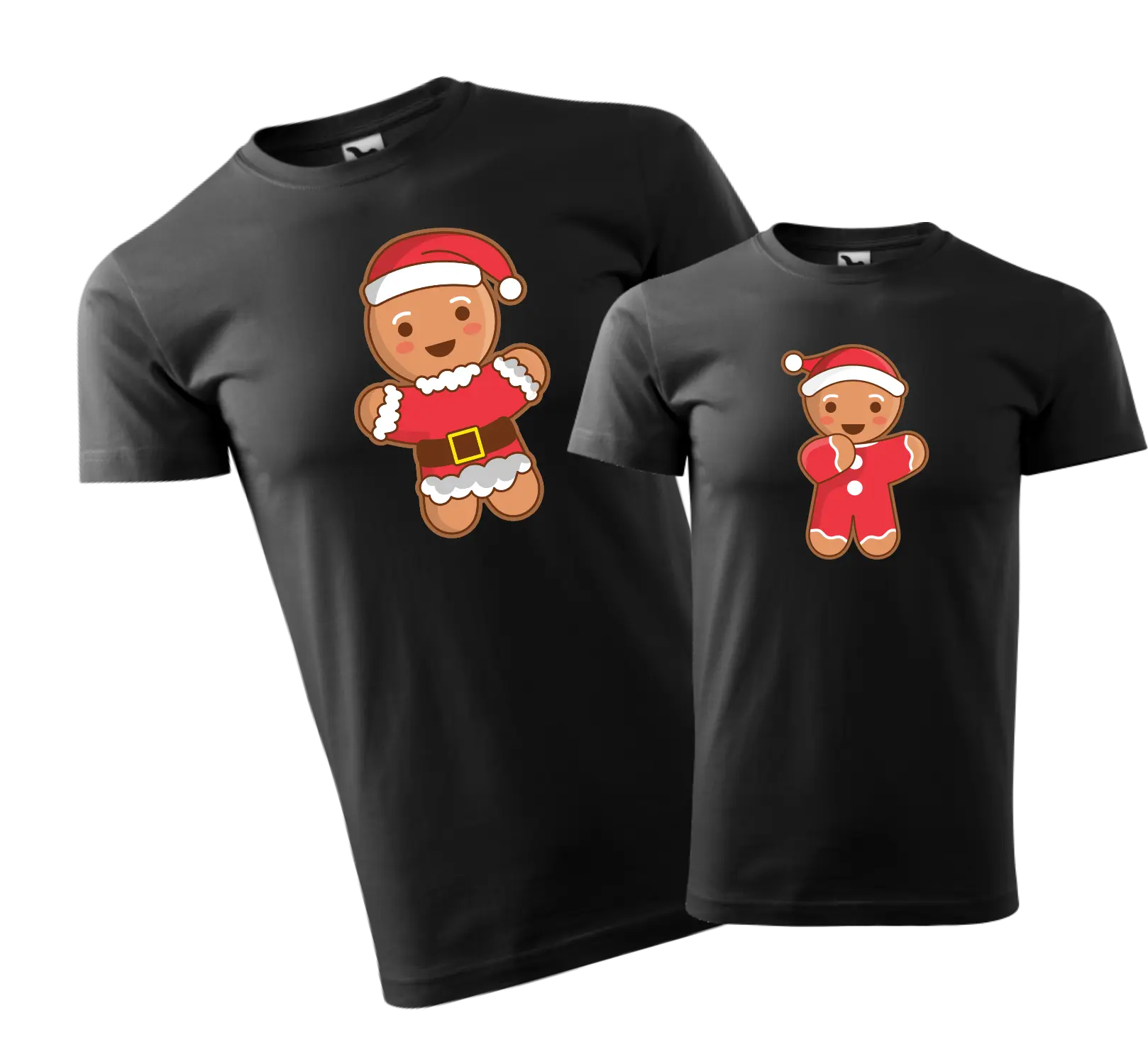 Centralnym elementem tego zestawu koszulek jest humorystyczny nadruk mikołajkowych ciastek – jedno ciastko dla mamy, jedno dla taty oraz mniejsze, urocze ciastko dla dziecka. Każde z ciasteczek ozdobione jest świątecznymi detalami, takimi jak czapeczki Mikołaja, co nadaje całości niezwykle świąteczny i zabawny wygląd. Każda koszulka podkreśla rolę członka rodziny, a nadruk symbolizuje ciepło, radość i wspólnotę, jaką przynosi Boże Narodzenie.