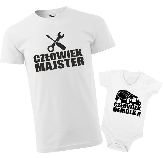 Szukasz wyjątkowego prezentu dla taty i jego małego pomocnika? Oto propozycja, która sprawi, że będą wyglądać jak najlepszy duet! Nasz zestaw koszulki dla taty i body dla dziecka z napisami: Człowiek Majster" dla taty i "Człowiek Demolka" dla dziecka.